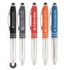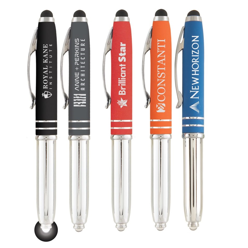 Griffiger, Soft-Touch 3-in-1 Kugelschreiber mit LED-Licht und weicher Touchpen-Funktion. Mit einer gummierten Kappe unden glänzendem Chrom-Gehäuse ist das Modell in 5 gängigen Farbvarianten erhältlich. Kann in voller Farbe bedruckt oder lasergraviertwerden.