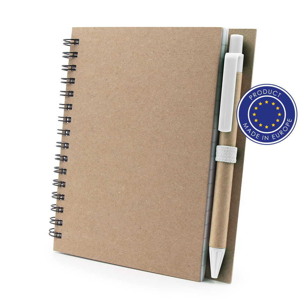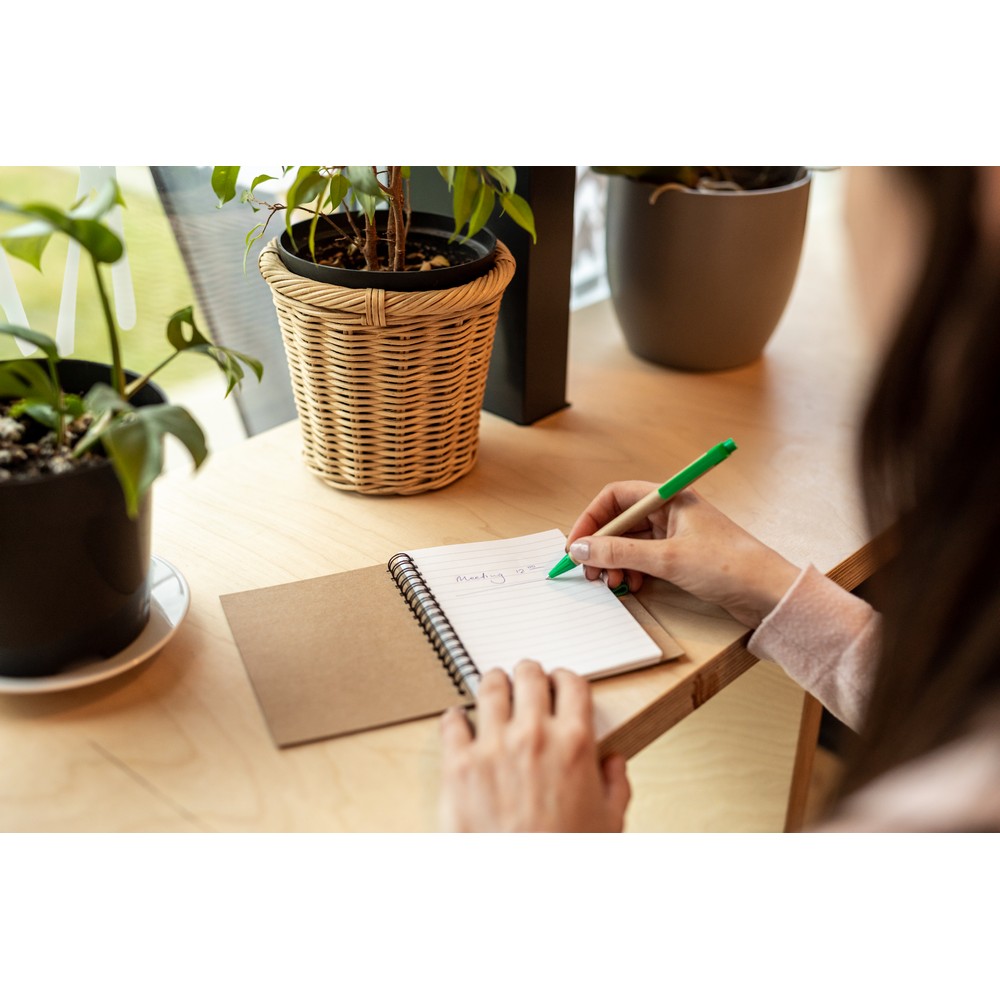 Entdecken Sie das Notizbuch A6 mit Kugelschreiber – der perfekte Imageträger für Ihre Marke! Mit seinen kompakten Maßen von 13 x 14,8 cm und einem Gewicht von nur 104 g ist dieses Produkt nicht nur handlich, sondern auch ein täglicher Begleiter, der den Alltag Ihrer Kunden erleichtert. Das hochwertige Hardcover aus Recyclingkarton und der Kugelschreiber mit farblichen Details aus nachhaltigen Materialien unterstreichen Ihr Engagement für Umweltfreundlichkeit.